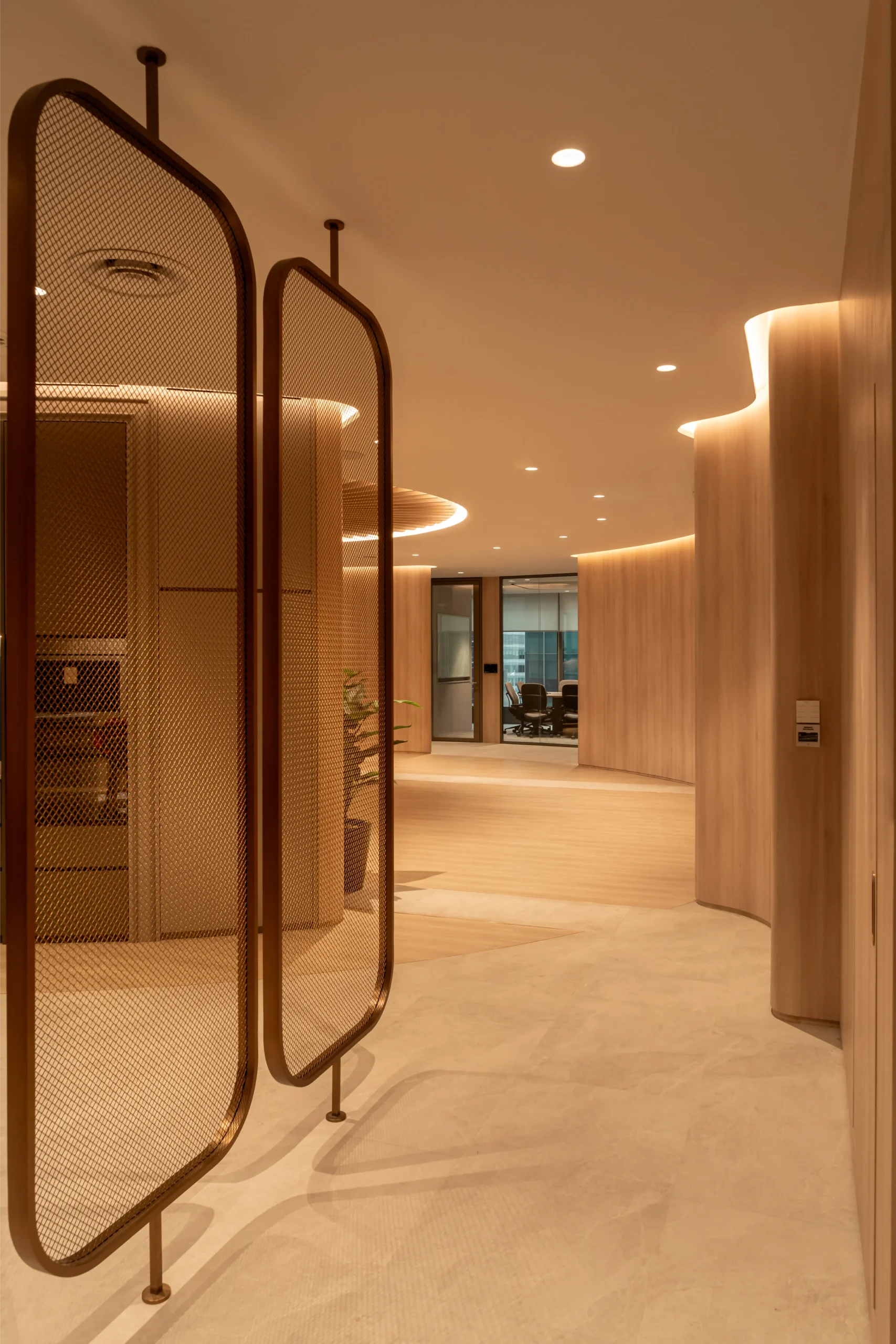 Ngee Koon’s approach was both rigorous and poetic. Colour palettes were drawn from the logo’s hues, infusing the space with a sense of calm authority. Curved pathways and corridors reference the logo’s geometry, guiding movement and encouraging serendipitous encounters. Meeting rooms, collaborative zones, and quiet nooks were arranged to flow organically into one another, their boundaries softened by the repetition of circular motifs and curves—a subtle yet constant reminder of connectivity.